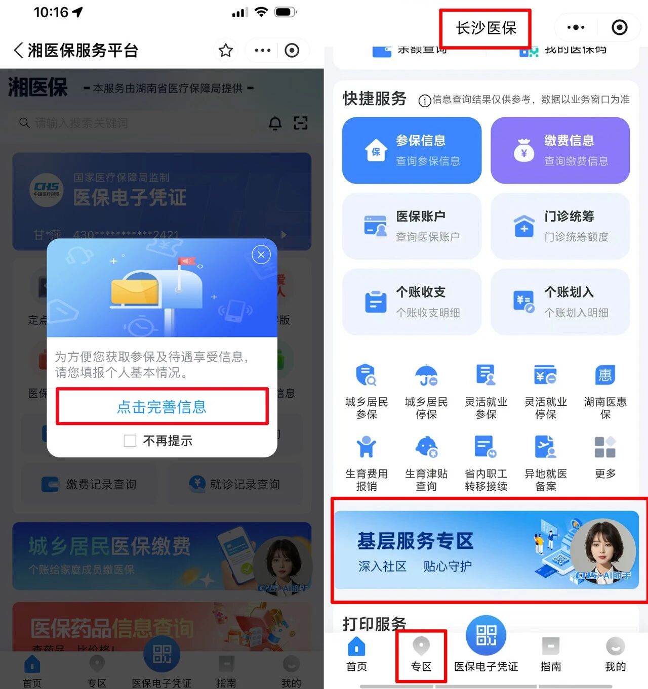 第二步:点击进入“湘医保”小程序,2025年首次登录提示“为方便您获取参保及待遇享受信息,请您填报个人基本情况”,点击完善信息;或者点击进入“湘医保”小程序,在专区中,选择对应的市州,找到“基层服务专区”。