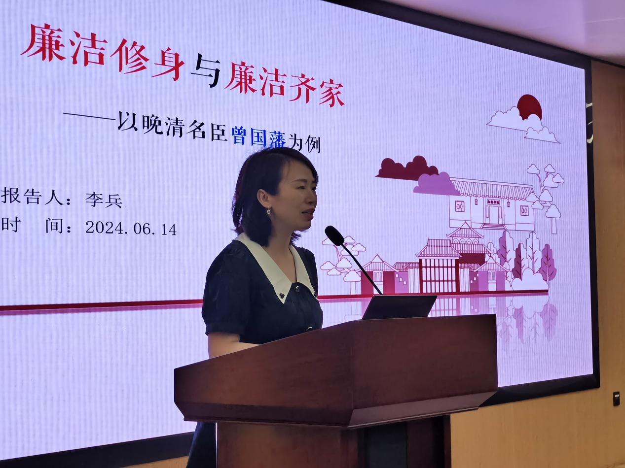 本次讲座邀请了湖南大学教育科学研究院教授、博士、文化学者李兵教授主讲。他以“廉洁修身与廉洁齐家”为主题,以晚清名臣、湖湘家风模范曾国藩为例,从廉洁修身、读书明理、廉洁齐家三大部分,讲述了家庭教育的重要性。